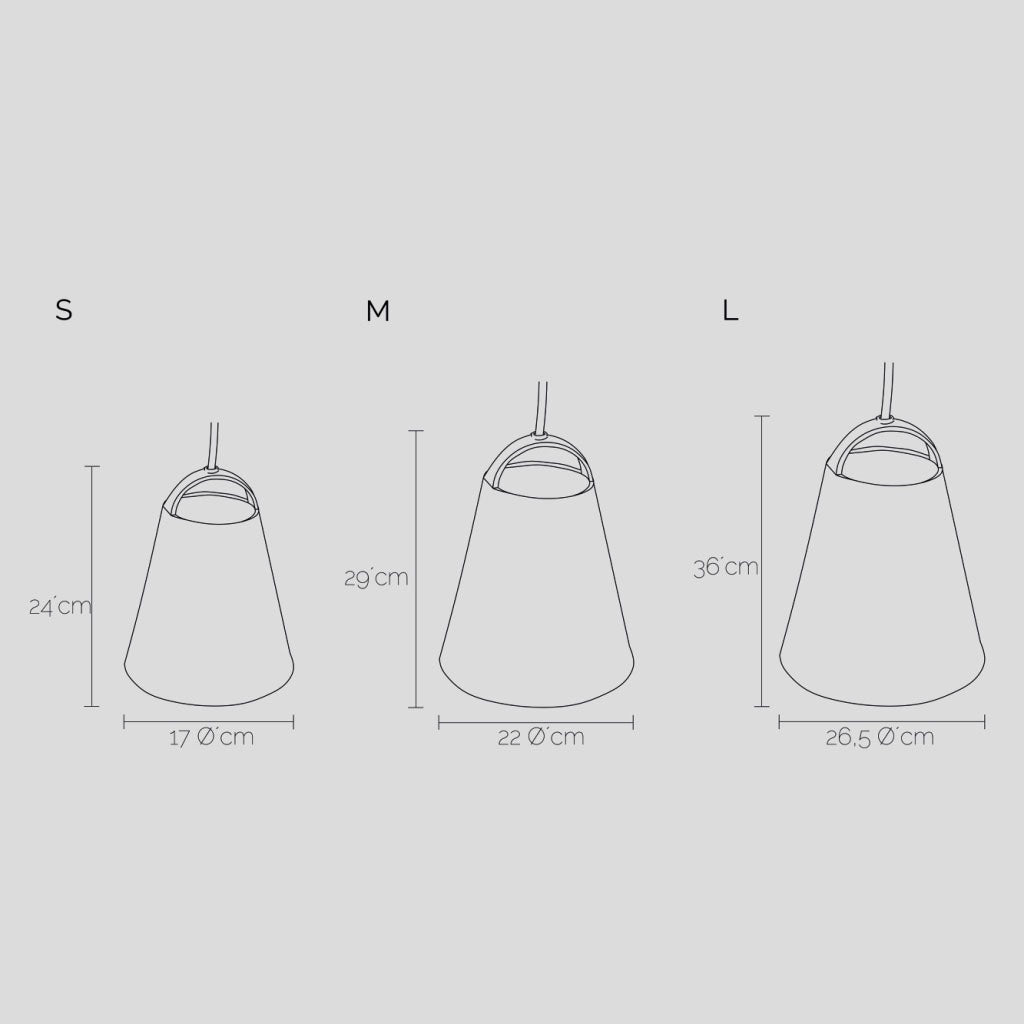 La lámpara Cencerro Pergamino colgante está hecha en cuero o pergamino, material de origen natural. Se recorta en base a plantillas y es hilvanado (cocido) a las argollas de alambre