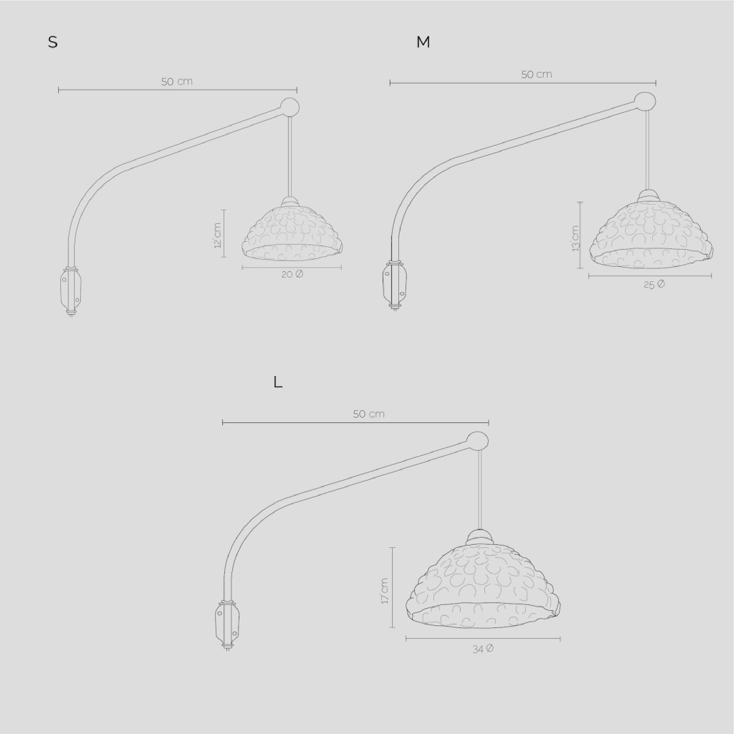 Delicadamente hecha a mano en cerámica y el apliqué de pared es de fierro al arco. Posee un diseño orgánico y escultórico. Su iluminación es focal. El brazo de fierro que va anclado a muro se mueve de un lado a otro. Tiene múltiples usos; como apliqué de pared en un living, lámpara de velador, al lado de un arrimo o para la decoración de un rincón especial. Viene con suficiente cable para llegar a un enchufe en el caso de que la salida de luz no se encuentre en el muro.